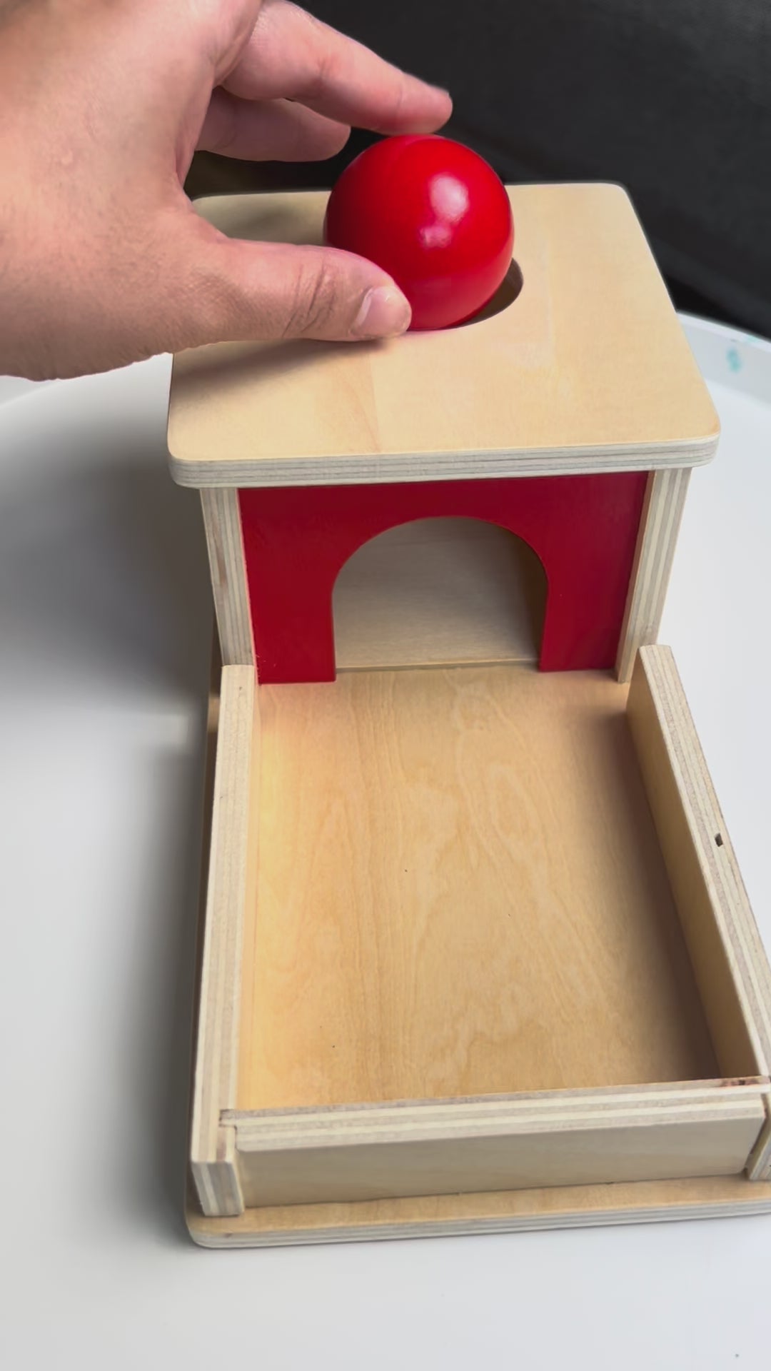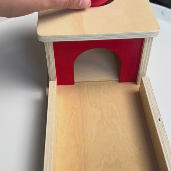 Este material Montessori es ideal para bebés a partir de los 6 meses. Invita al niño a colocar la bola en el orificio superior y observar cómo desaparece… ¡y reaparece! Un juego simple pero fascinante que estimula la coordinación, la permanencia del objeto y la motricidad fina.