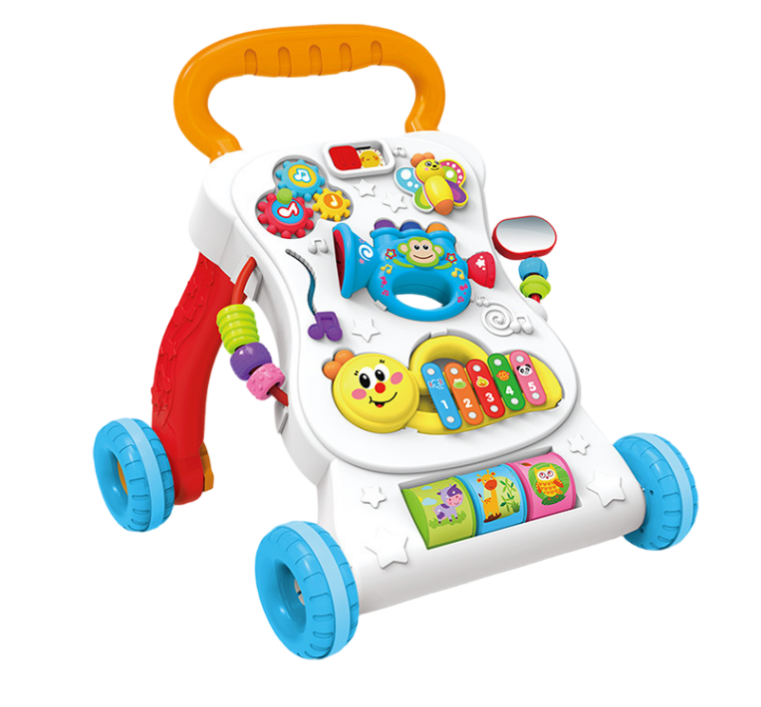 Este caminador no solo ayuda a tu bebé a dar sus primeros pasos, sino que también es un centro de actividades lleno de juegos, colores, sonidos y texturas. Tiene un panel interactivo con luces, engranajes, teclado musical, espejo, piezas móviles y mucho más.